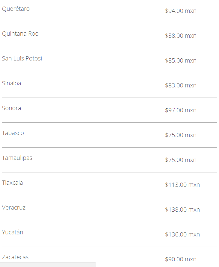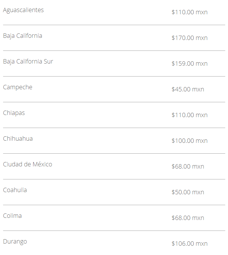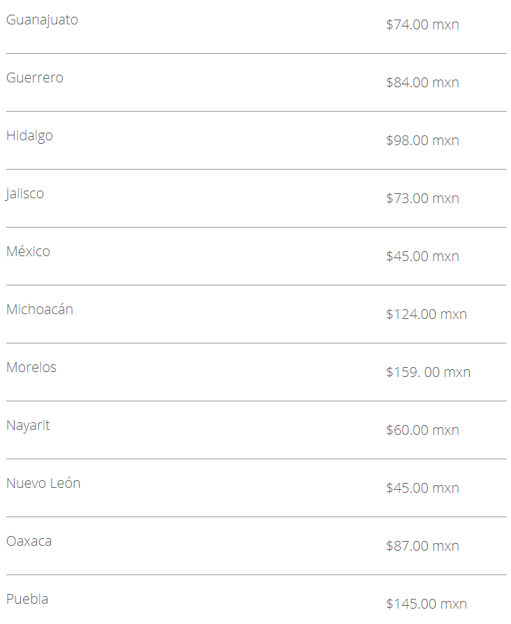 Cada entidad define sus precios, aunque cabe destacar que Baja California cuenta con la tarifa más alta por este trámite, el cual tiene un costo de $170.00 pesos, seguido por Morelos y Baja California Sur con un precio de $159.00 pesos, mientras que en el Estado de México y Nuevo Léon tiene un costo por $45. 00 pesos y en Quintana Roo cuesta $38.00 pesos.