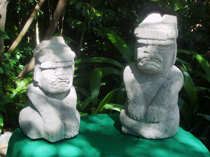 Dichas esculturas que son prácticamente iguales, tienen la forma de un individuo desnudo sentado con las piernas cruzadas, los brazos al frente y las manos colocadas sobre los tobillos, con el torso ligeramente inclinado hacia delante.